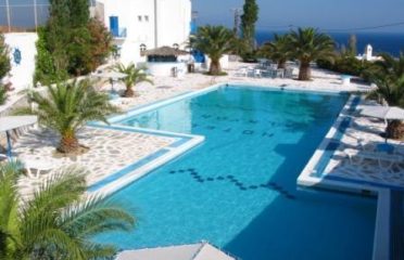 The hotel overlooks the blue Aegean Sea. The hotel perfectly combines traditional Cycladic architecture with modern amenities. This hotel is built in the style of an amphitheater. The hotel is an excellent choice for a relaxing